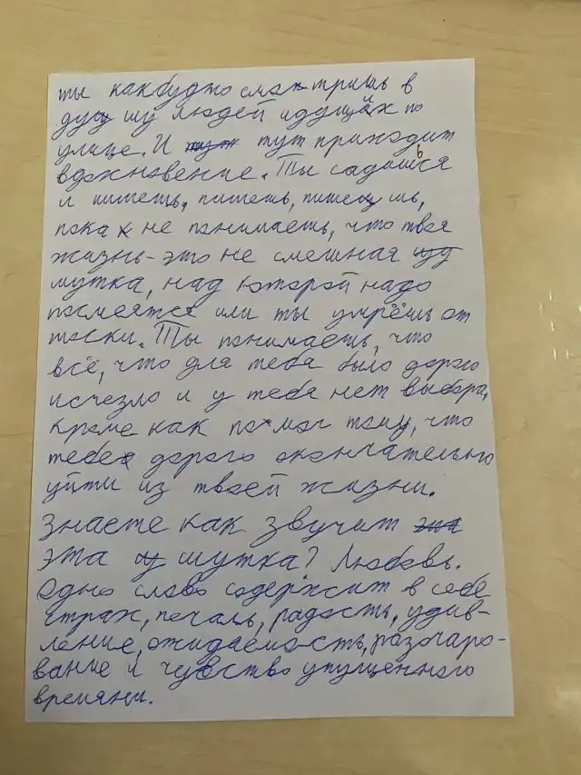 "Ты как будто смотришь в душу людей, идущих по улице. И тут приходит вдохновение. Ты садишься и пишешь, пишешь, пишешь, пока не понимаешь, что твоя жизнь — это несмешная шутка, над которой надо посмеяться, или ты умрёшь от тоски. Ты понимаешь, что всё, что было для тебя дорого, исчезло, и у тебя нет выбора, кроме как помочь тому, что тебе дорого, окончательно уйти из твоей жизни. Знаете, как звучит эта шутка? Любовь. Одно слово содержит в себе страх, печаль, радость, удивление, ожидаемость, разочарование и чувство упущенного времени."