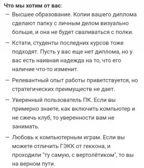 На одном из сайтов, где выкладываются вакансии, появилось очень странное объявление. Организации понадобился администратор в клуб виртуальной реальности. Все бы ничего, но описание получилось довольно забавным и необычным. Задета даже тема необходимости высшего образования в России, но и это далеко не все. Как вам такая вакансия?