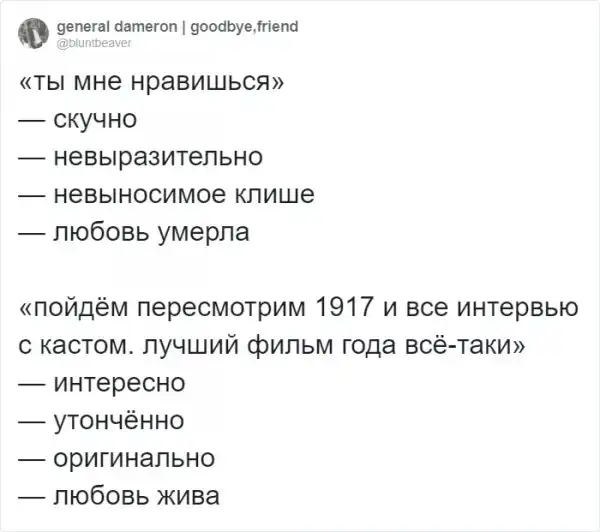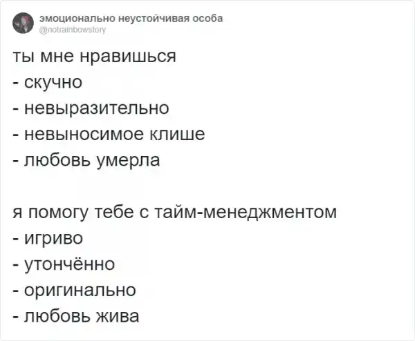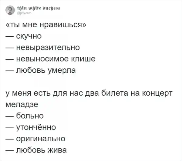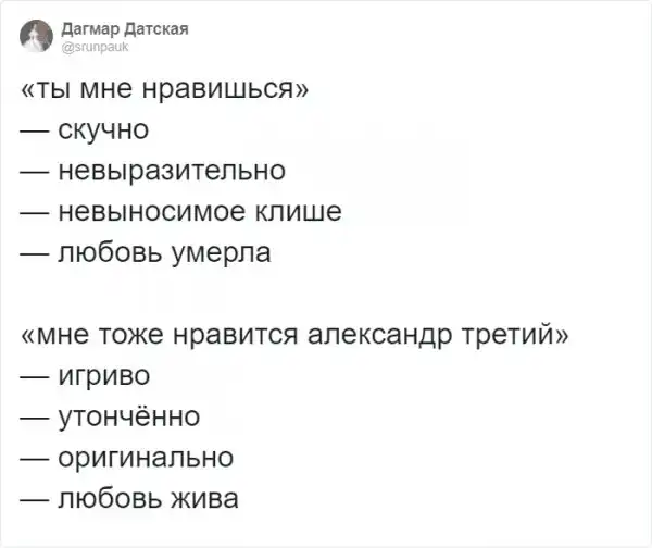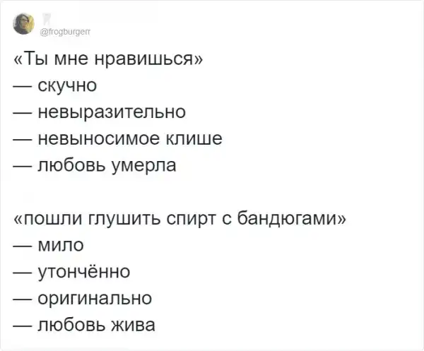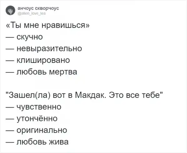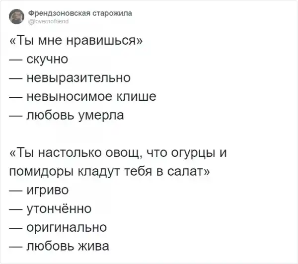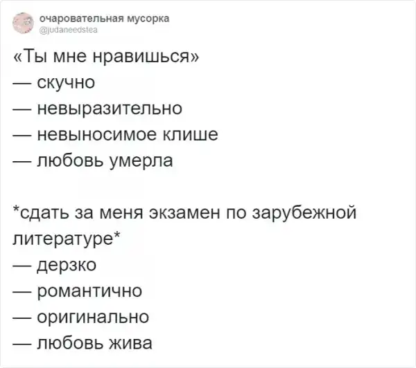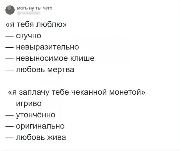 "Я тебя люблю" - это заветные три слова, которые мечтает услышать каждый человек от объекта своего воздыхания. Но многие считают, что это признание превратилось в клише, которое потеряло свою значимость. Пользователи Твиттера решили запустить ироничный флешмоб, в котором они предложили заменить банальное "я люблю тебя" на что-нибудь более утонченное. Давайте посмотрим, что у них получилось.