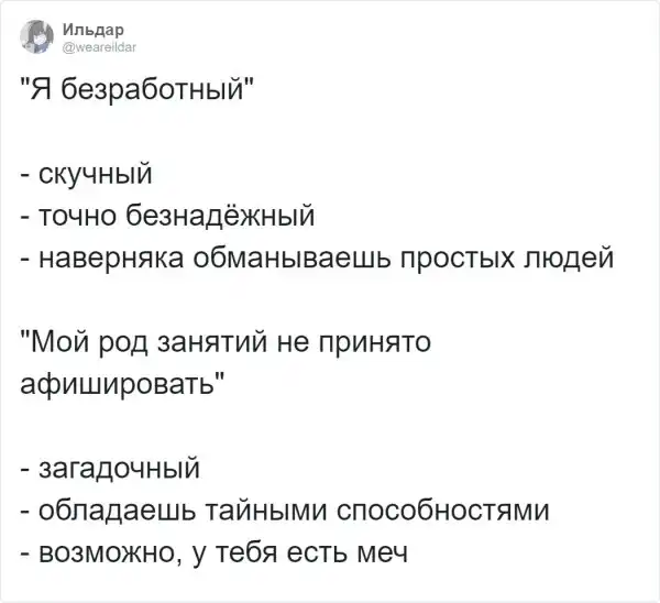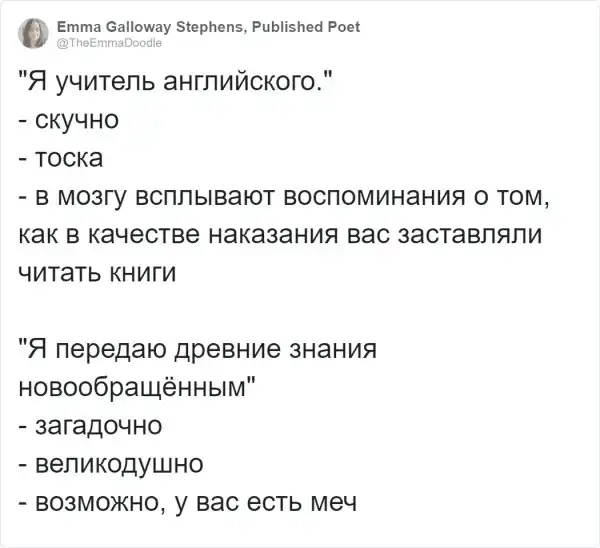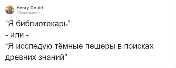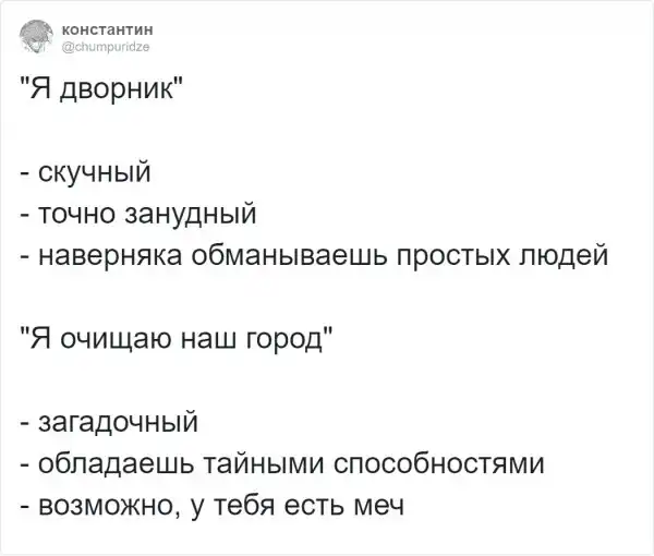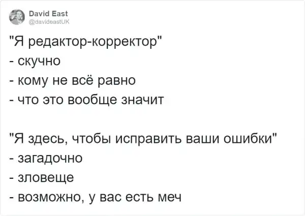 Где, как не в Твиттере собираются любители подурачится и фантазировать. На этот раз пользователи решили устроить и флешмоб и показать скучные профессии с необычной стороны. И желательно, чтобы получилось загадочно. Организатором выступил редактор-корректор Дэвид Ист. В описании своей работы он обозначил себя как человека, который исправляет чужие ошибки - и, возможно, у него даже есть меч! Пользователи быстро подхватили эту схему. Давайте посмотрим, что у них получилось.
