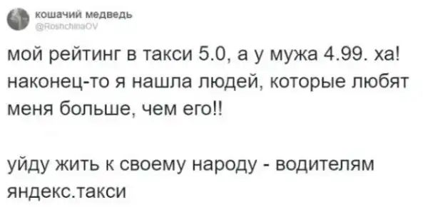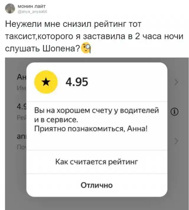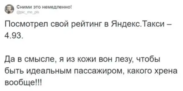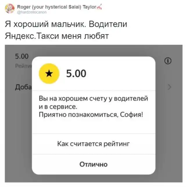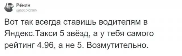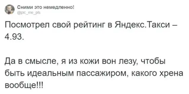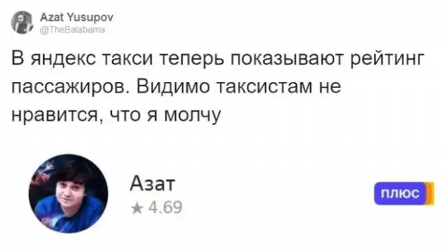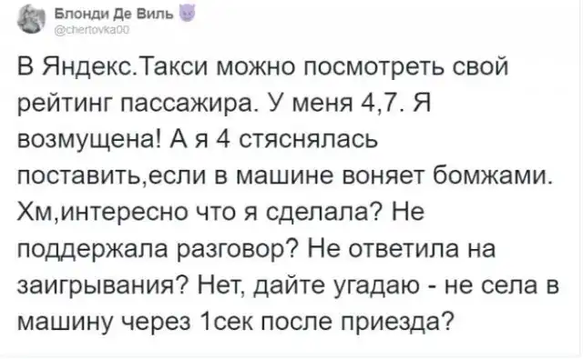 Оказывается, не только водители имеют собственный рейтинг, видимый пассажирам. Сервис «Яндекс.Такси» сделал рейтинг и самих пассажиров, а пользователи в социальных сетях по-разному отнеслись к нововведению. Как выставляется оценка — многие не знают, однако даже снижение балла на 1 пункт вызывает шквал осуждений. Пожалуй, скоро не получится кричать «Вези меня, мра*ь!».