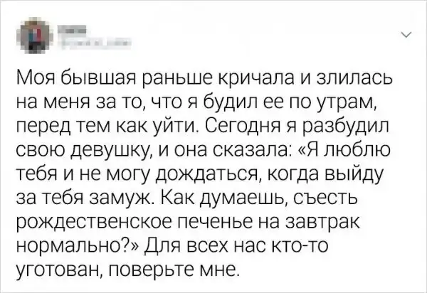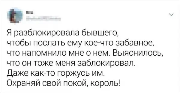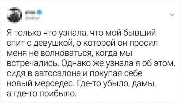 Расставание - это всегда неприятно и печально. Но люди реагируют на событие по-разному: кто-то грустит и таит обиду, другие со смехом вспоминают былые времена, а есть и те, кто делает выводы и придает их огласке. Так и сделали авторы этих твитов. Они поведали о забавных, а иногда печальных случаях, которые приключались с ними после разрыва отношений.
