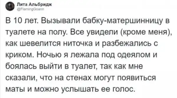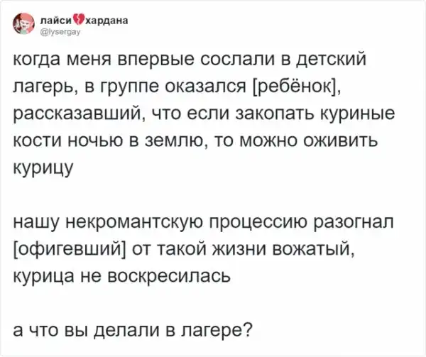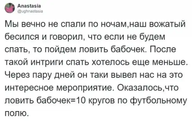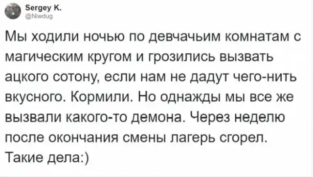 Отправляли ли вас в детстве в детские лагеря? Если да, то вы прекрасно знаете, что царит в них своя атмосфера. Грозные вожатые, страшные истории, местные легенды, розыгрыши друг друга и многое другое. Пользователи в Twitter решили вспомнить некоторые истории из своего детства.