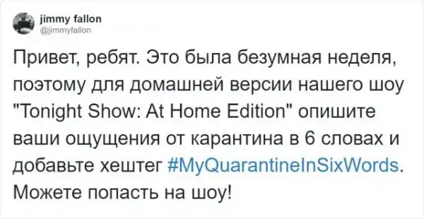 Популярный американский телеведущий Джимми Фэллон решил запустить в Твиттере новый тред под названием: "Мой карантин в шести словах". Судя по тому, что ему прислали, народ по-разному относится к сидению дома. Интроверты счастливы, как никогда, а другие уже на стенку лезут. Давайте посмотрим, что написали Джимми пользователи.
