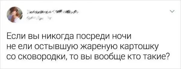 Порой общаешься с человеком и, казалось бы, все нормально. А потом "бац" и ты узнаешь какую-нибудь мелкую делать, после которой все общение сходит на нет. Например, как можно доверять человеку, который никогда не ел холодную жареную картошку прямо со сковородки посреди ночи?