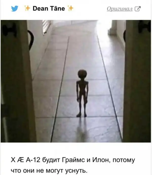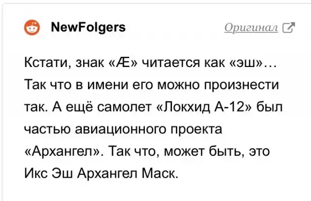 X — это «неизвестная переменная», Æ — «ее эльфийское написание аббревиатуры AI» (любовь и/или искусственный интеллект), а A-12 — название американского самолета-разведчика. Граймс пояснила, что он является предшественником ее любимого самолета SR-17. «Никакого оружия, никакой защиты, только скорость. Велик в схватке, но без насилия», — написала мама.