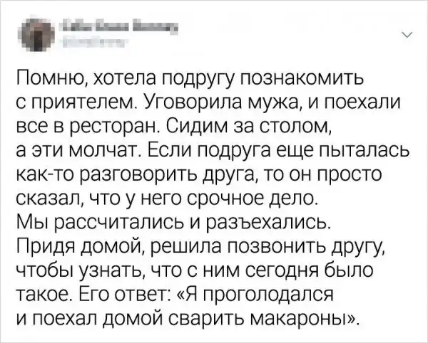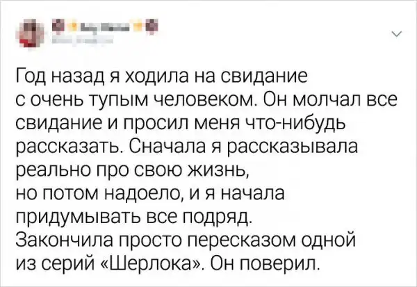 Когда мы смотрим голливудские мелодрамы, кажется, что найти "ту самую" спутницу жизни очень легко. Достаточно доверится судьбе и случайно столкнуться тележками в супермаркете или что-то в этом роде. Но в реальности все не так безоблачно. Давайте посмотрим забавные твиты про провальные свидания, которые пришлось пережить пользователям.