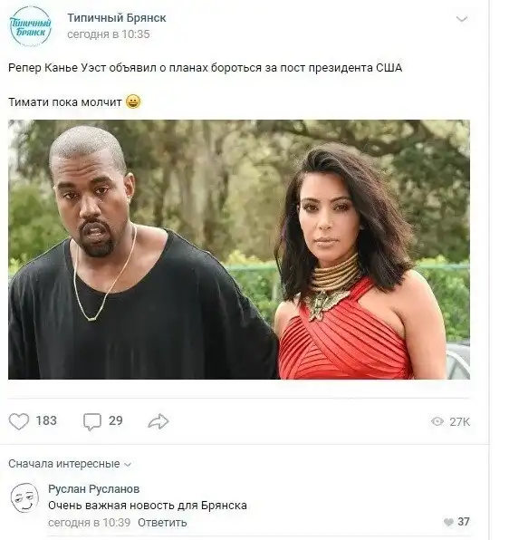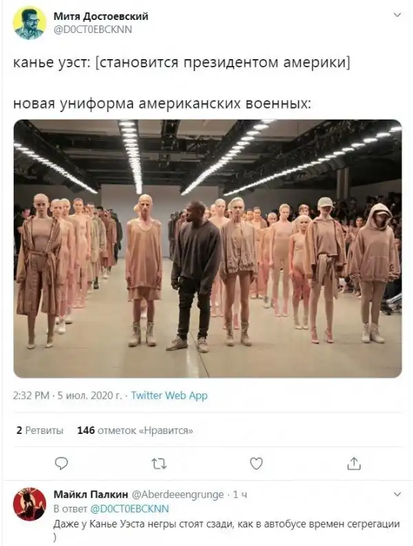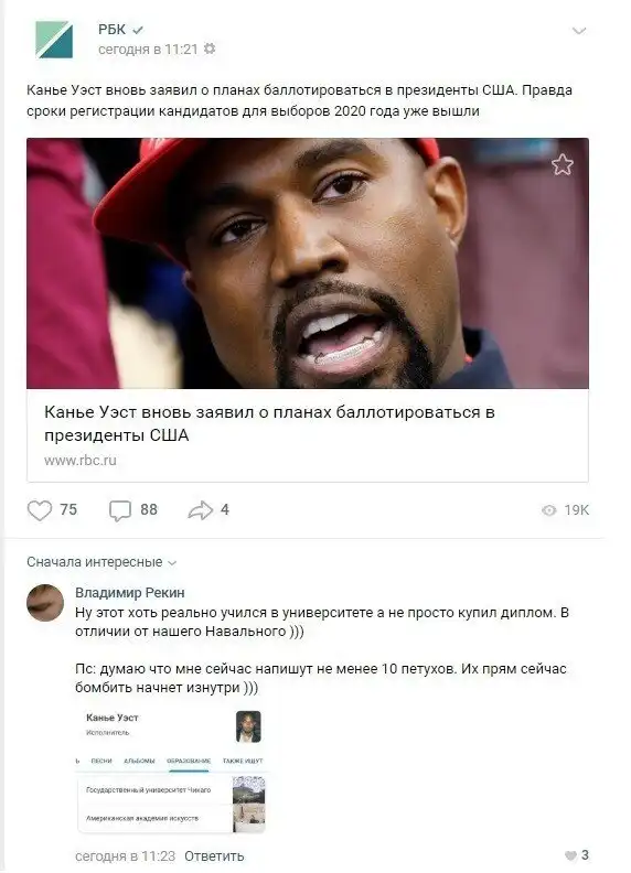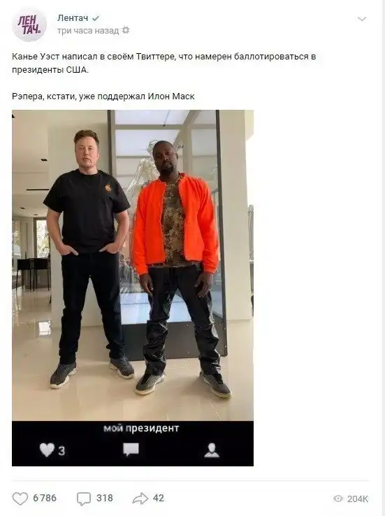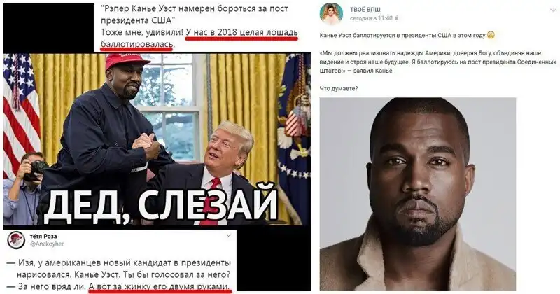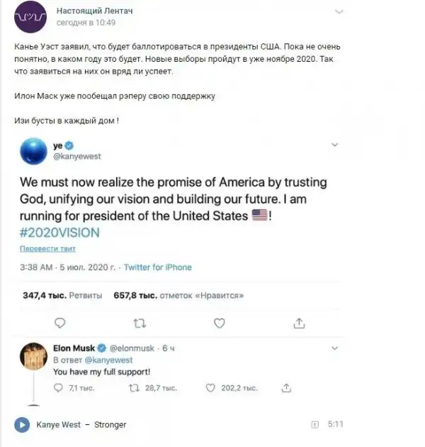 Известный на весь мир рэпер Канье Уэст объявил о намерении баллотироваться на пост президента-2020. Темнокожего музыканта уже поддержал в твиттере другой народный любимец — предприниматель-ракетчик Илон Маск. Ну, по традиции, интернет эта новость знатно потрепала.