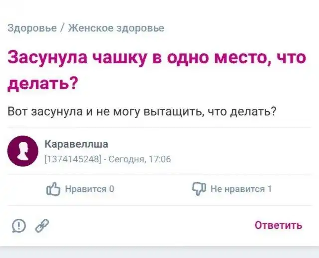 Женские форумы — коллекция невообразимой дичи с профильных форумов, ответов мэйл ру и прочих уголков интернета, где лютуют несостоявшиеся пациентки соответствующих клиник ))