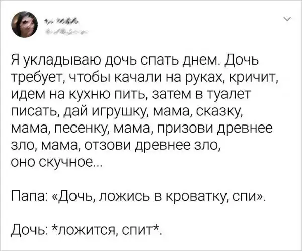 В Сети можно найти миллион мамочек-блогеров с идеальной семьей, которые делятся "мудрыми лайфхаками" по уходу за малышами. Но авторы этих твитов не стремятся быть идеальными. Они лишь любят своих детишек, делают все возможное и стараются не сойти с ума в процессе. А преодолевать трудности им помогает юмор. Давайте посмотрим подборку забавных твитов о родительстве.