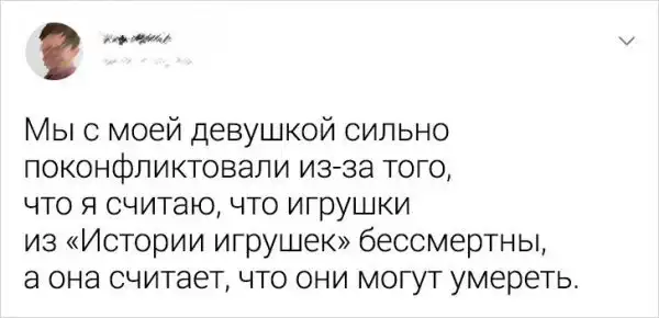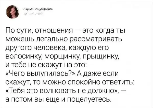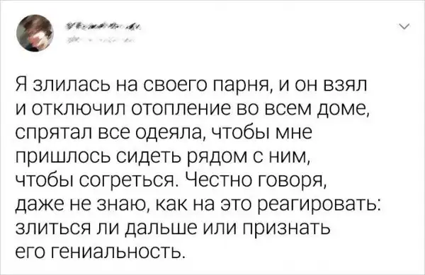 Многие думают, что отношения - это сплошная романтика, поцелуйчики и прогулки под луной. Да, без этого никуда, но конфетный период заканчивается быстро, а вслед за ним наступает маленькая война. Авторы этих твитов решили поделиться забавными историями об их отношениях, которые напоминают борьбу за выживание. Но, как говорится: "Милые бранятся, только тешатся".