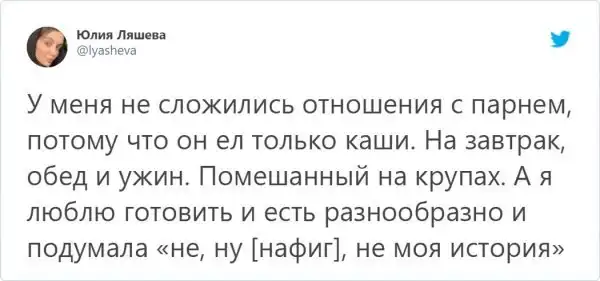 Отношения - это всегда непросто. Как парень, так и девушка должны идти на уступки и компромиссы, чтобы сохранить отношения. А порой они заканчиваются, не успев толком начаться. В Твиттере пользователи рассказали из-за какой ерунды у них не сложились отношения. Давайте почитаем эти забавные и житейские фейлы.