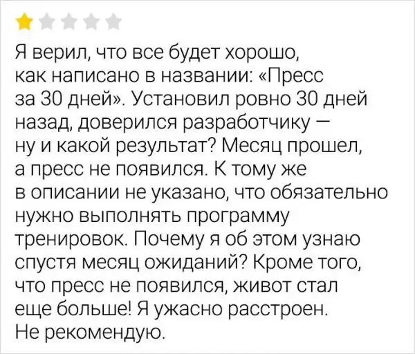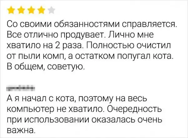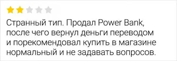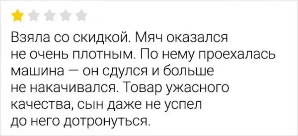 Порой люди пишут такие искрометные отзывы в интернет-магазинах, что сразу же возникает желание купить тот или иной товар. В этих отзывах есть все: интригующая завязка, драматичное развитие и, конечно же, юмор. Давайте посмотрим.