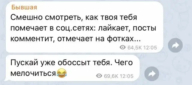 В жизни каждого мужчины есть надоедливая бывшая, которая прилипла как банный лист и непонятно что хочет: то пишет одно, то пишет другое, то просит любви вновь, то посылает куда подальше.