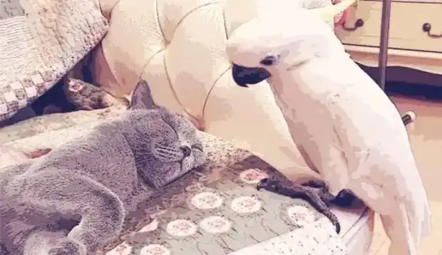 Какаду дремал, прислонившись к своему коту. Он что-то время от времени скрежетал во сне, а кот тихонько мурлыкал.