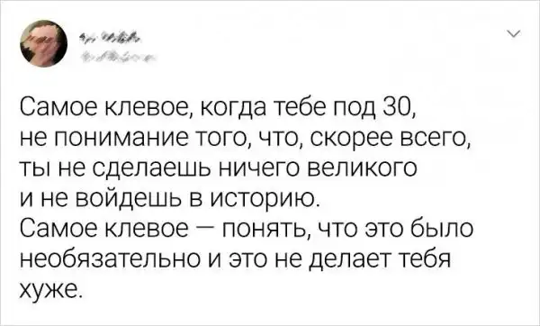 Порой бывают моменты, когда просыпаешься по утру и в муках пытаешься выключить будильник, в голове закрадывается мысль, о том, что первую пару можно пропустить. А через несколько минут приходит осознание, что тебе уже за 30 лет и ты опаздываешь на важное совещание. Авторы этих забавных и жизненных твитов рассказали, как им пришло осознание того, что молодость уже давно прошла.