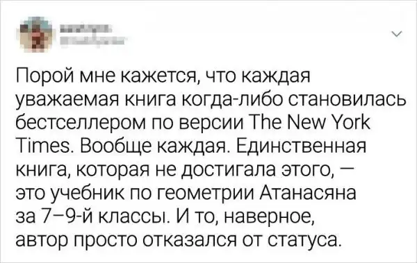 Все наверняка слышали о том, что смех продлевает жизнь. А знали ли вы, что чтение книг так же может сделать нашу жизнь дольше? Ученые предполагают, что чтение увеличивает количество связей между мозговыми клетками, а это снижает риск нейродегенеративных заболеваний. Поэтому можно совместить приятное с полезным: шутить и читать книги. Именно так и делают авторы этих твитов.