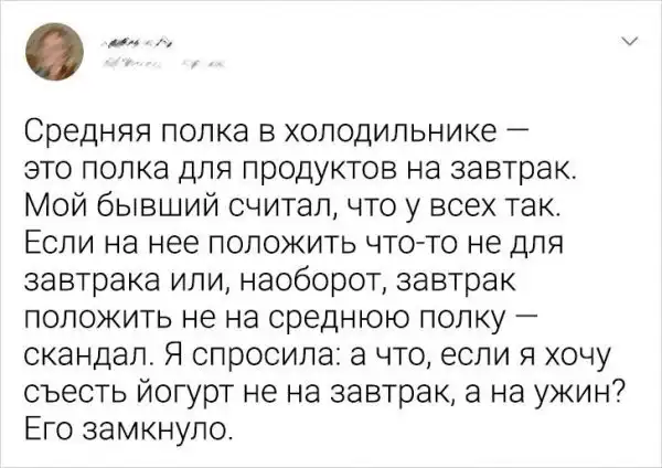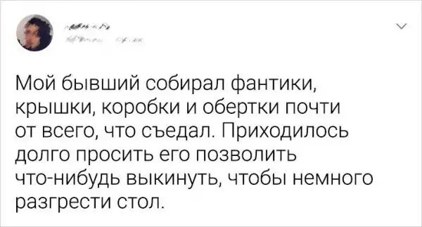 Пожалуй, все согласятся с тем, что у всех людей есть свои тараканы в голове. У кого-то их много, а других один таракан... но очень большой (например, мадагаскарский).Пользователи Твиттера решили объединится в общем треде и поведать о странных причудах своих бывших.