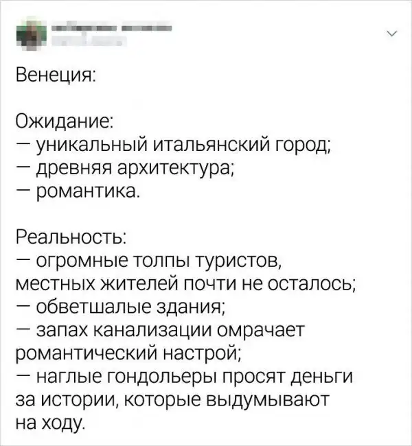 Иллюзии - частый спутник мечтателей, которые представляют себе жизнь в знакомом только по экскурсиям и картинкам городе как нечто волшебное и прекрасное. Однако в действительности все оказывается не таким лучезарным. Как говорится, не стоит путать туризм и эмиграцию.