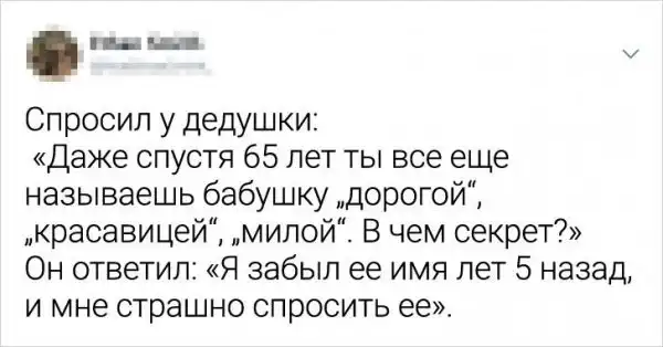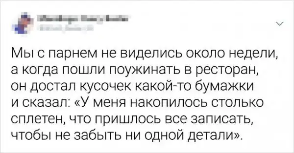 В самом начале отношений между парнем и девушкой царит идиллия. Но потом эта лодочка любви разбивается об скалы реальности. И после этого наступает момент, когда отношения проверяются на крепость. Чтобы успешно сдать этот экзамен, стоит относится к невзгодам с юмором. Как авторы этих забавных и жизненных твитов об отношениях.