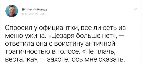 Если вы думаете с чем бы вам сейчас выпить чаю: с бутербродом или печеньем, то предлагаем вам провести перерыв с подборкой забавных твитов. В них нет калорий, но при этом они отлично заряжают позитивом и положительной энергией. Всем веселого просмотра.