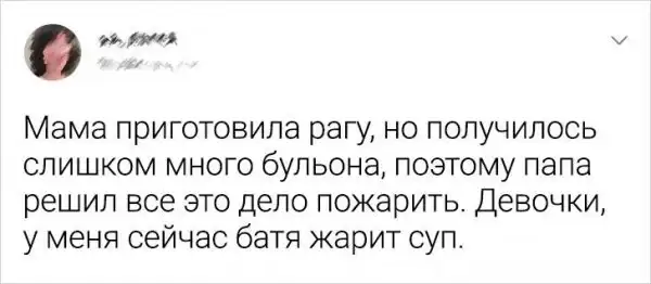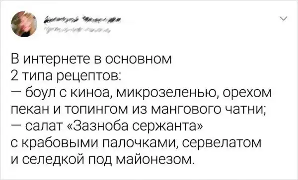 К готовке люди относятся по-разному. Для кого-то - это настоящее искусство и простор для творчества. А для других людей - сплошная каторга и рутина. Две эти категории объединились в единой подборке забавных твитов, посвященных приготовлению еды.