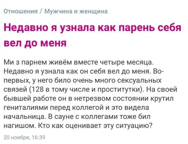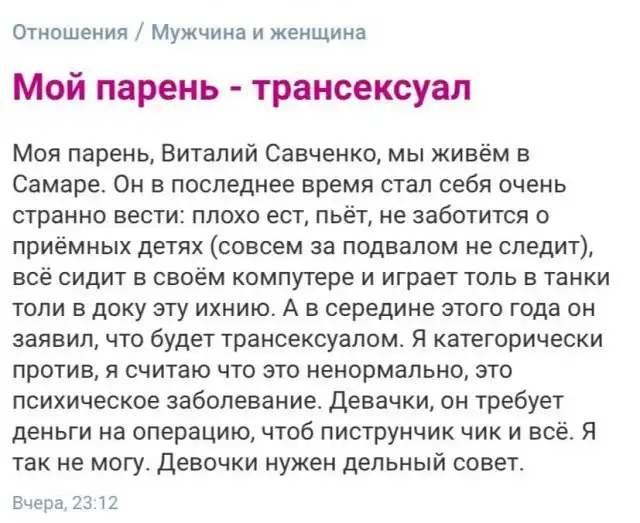 Женские форумы - это особенное место, в которых не действуют законы логики и здравого смысла. Тут барышни и некоторые отчаявшиеся мужчины ищут мудрости у более мудрых пользователей. Давайте поглядим, что же беспокоит этих бедняг сегодня.