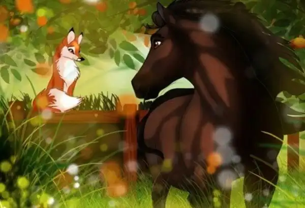 Маленький лисёнок, забыв о страхе, радостно прыгал вокруг большого льва, который снисходительно позволял рыжему зверьку топтаться по его хвосту и даже слегка его прикусывать. Рядом паслась грациозная лошадка с шикарной черной гривой. Она была спокойной и, кажется, совсем не боялась грозного хищника.