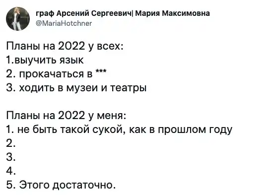 Обычно люди намечают свои примерные цели и планы на год. В конце очередного этапа они их подводят и публикуют в соцсетях. Так как последние несколько лет выдались непростыми, пользователи не ждут чудес, а мечтают о чем-то простом и приятном. Мы собрали забавные, ироничные и искренние желания людей.