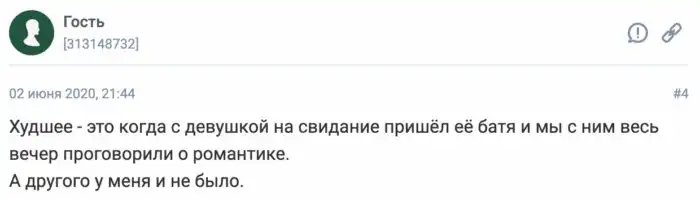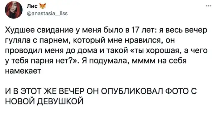 Даже те, кто давно в браке, когда-то ходили на свидания. Встречи двух людей противоположного пола не всегда проходят гладко. Пользователи соцсетей поделились историями об их худших свиданиях.