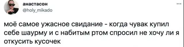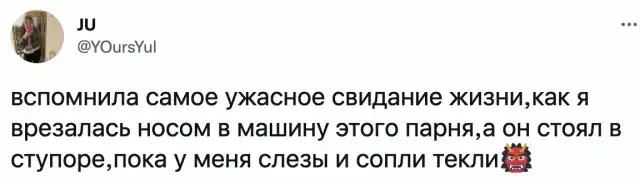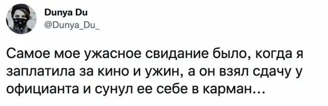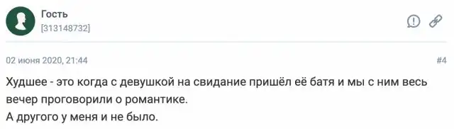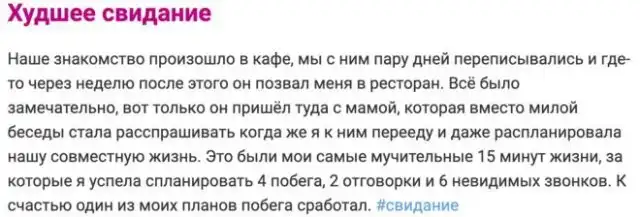 Пожалуй, каждому человеку доводилось побывать на свидании. Это должен быть романтический момент, когда люди получше узнают друг друга и прикидывают, смогут ли идти в будущее вместе. Правда, это не всегда так - пользователи решили рассказать о самых провальных свиданиях в их жизни. К слову, если и у вас есть история о каком-нибудь запомнившемся свидании - добро пожаловать в комментарии.