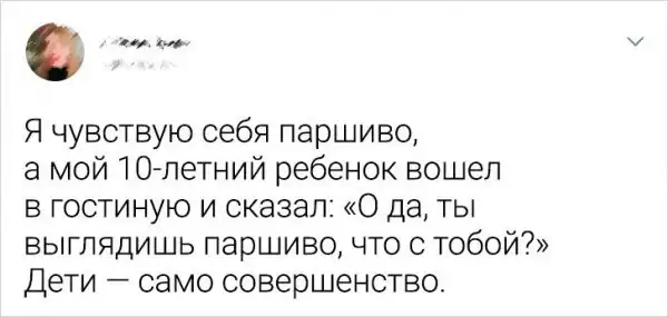 Дети имеют особый образ мышления, который кардинально отличается от взрослого. Малыши, как правило, предпочитают сразу говорить горькую правду прямо в лоб. Такая детская искренность может обескуражить любого. Пользователи с просторов Твиттера решили рассказать о том, какие забавные перлы выдали их детишки.