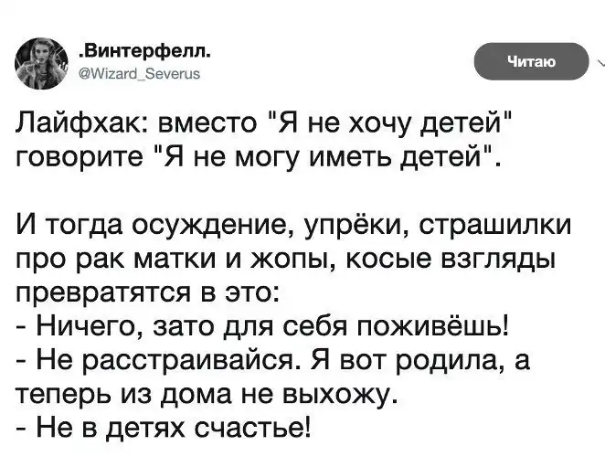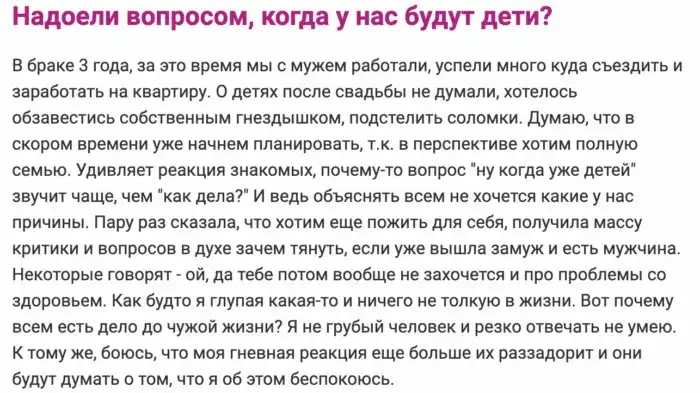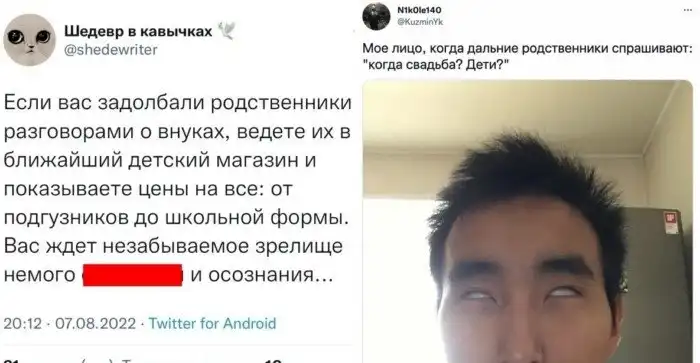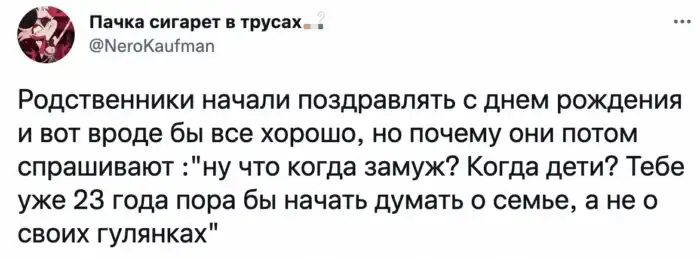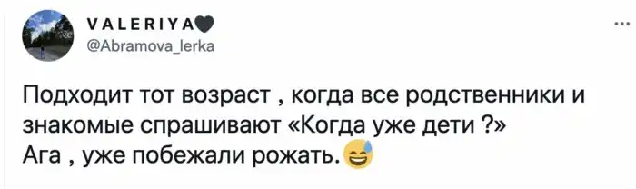 Родственники с вопросами о детям вторгаются в личные границы тех, кому от 20 до 40, но еще не обзавелся семьей и отпрысками. В Твиттере пользователи активно обсуждают родительскую позицию и реакции на отрицательные ответы.