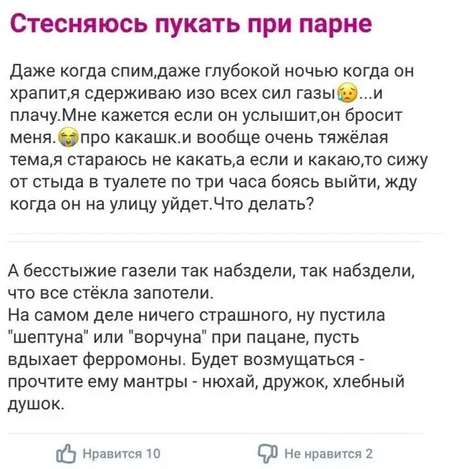 Что делать, если свекровь смеется над именем для ребенка? Как научиться "вкусно" пускать газы? Куда бежать, если ваш парень постоянно читает рэп? Пока лучшие ученые планеты пытаются разгадать эти тайны, девушки на женских форумах уже раздают советы. Давайте посмотрим, что страждущих мучает на этот раз?