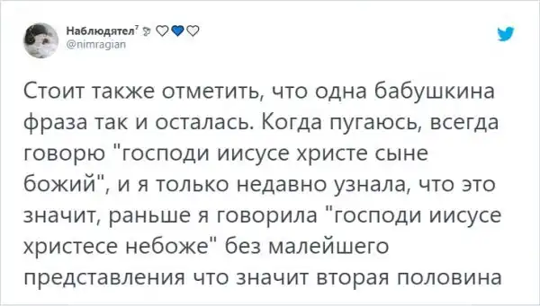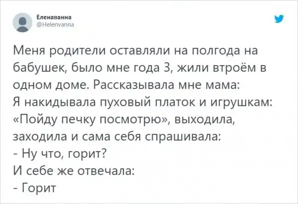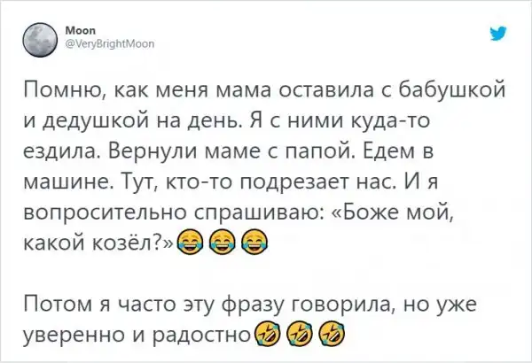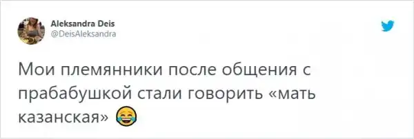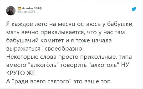 Бабушки и дедушки могут быть суровы в воспитании своих детей. Но когда у них появляются внуки... это уже совсем другая история. Бабули и дедули обрушивают на малыша всю свою нежность и любовь. Поэтому понянчить внучек и внучков для них невероятная радость, а для мам и пап - долгожданный отдых от родительства. Правда, юные умы крайне любопытны и легко запоминают все, что слышат от старших. Это факт подтвердила одна девушка из Твиттера, которая рассказала, каким фразам научился ее племенник после общения с бабушкой и дедушкой. В итоге это выросло в целый тред, в котором пользователи поделились такими же забавными историями.
