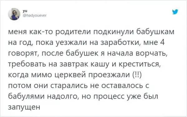 Пользовательница Твиттера рассказала, что может выдать ребёнок, который много сидит с бабушками и дедушками.