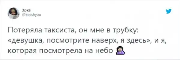 Таксисты - это бесконечный источник забавных историй. Вот, например, девушка поведала в своем Твиттере о переписке с таксистом, которого ей никак не удавалось найти. Водитель заявил, чтобы она посмотрела... наверх. Девушка так и сделала, но в небе его тоже не оказалось. Теперь в Твиттере гадают, что же хотел сказать таксист.
