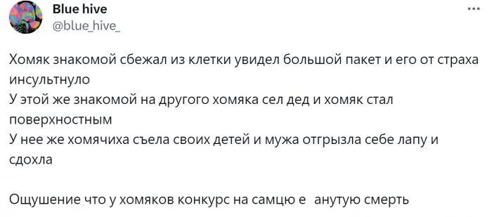 У людей спросили, каким самым странным способом умер их хомяк. И, честно говоря, многообразие вариантов просто неисчерпаемо.