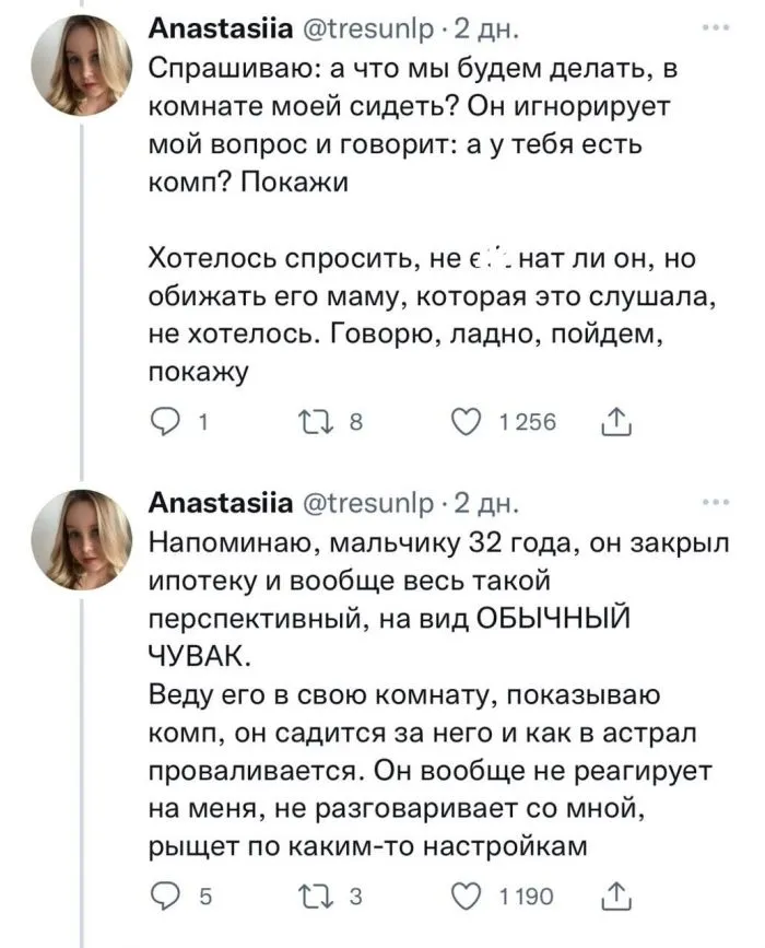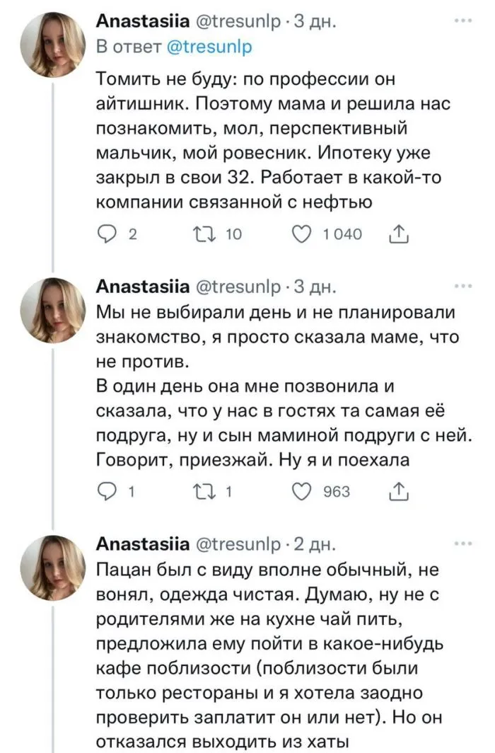 В Твиттере завирусилась история о знакомстве девушки с айтишником. Перспективного 32-летнего мужчину "подогнали" по знакомству. Годный "экземпляр" к своим годам закрыл ипотеку, а в наше время это дорогого стоит, поэтому девушка решила не противиться и взглянуть на перспективного кавалера.