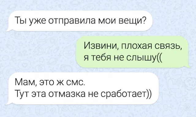 Маме абсолютно все равно сколько лет ее ребенку. Ведь для нее он всегда будет маленьким сорванцом, которые не справится с жизненными трудностями без маминой заботы и помощи. Поэтому, сколько бы лет вам ни было, переписки с мамами - это отдельная история. И порой очень веселая, ибо героини этой подборки имеют отличное чувство юмора.