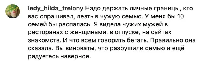 В комментариях некоторые люди начали обвинять Анастасию, указывая на то, что она вмешалась в чужие отношения.