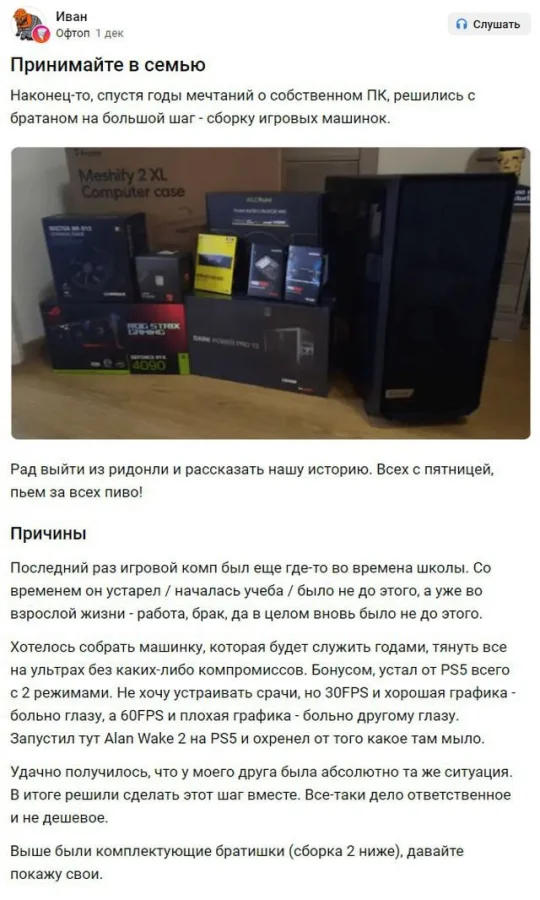 Подробную историю своего приключения парень решил поделиться в формате лонгрида на DTF. Его рассказ вызвал волну эмоций и троллинга среди комментаторов. Но, вероятно, самым удивительным аспектом оказался игровой вкус автора. После игры в Starfield (которая стала разочарованием века от Bethesda), он теперь стоит перед дилеммой: что делать с этим мегапроизводительным компьютером? Давайте вместе окунемся в историю этого несчастного геймера.