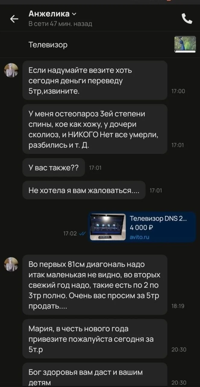 Жадная женщина пыталась разжалобить продавца телевизора, чтобы купить технику за 5000 рублей. Она и про свои диагнозы рассказала, и про то, что "все умерли", и здоровья желала, и даже сообщила, что готова увезти товар "на телеге", но безуспешно.
