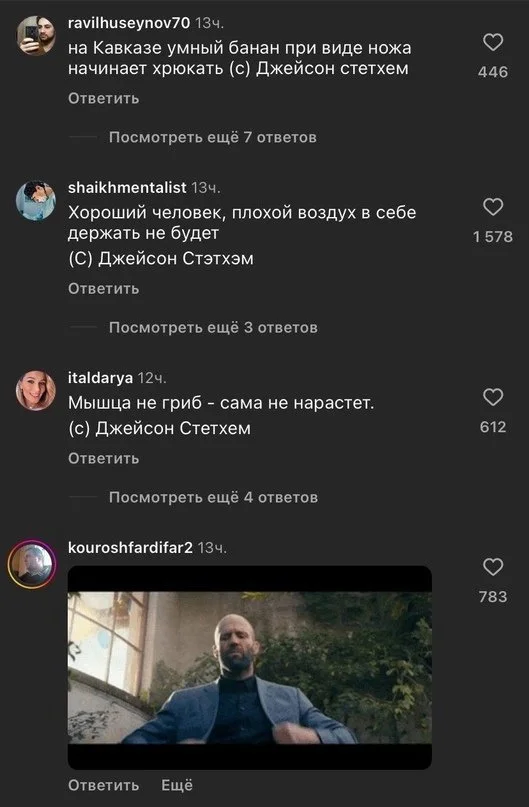Социальные сети Джейсона Стэйтема облюбовали русские комментаторы. Они следят за каждым шагом любимца и публикуют его "цитаты".