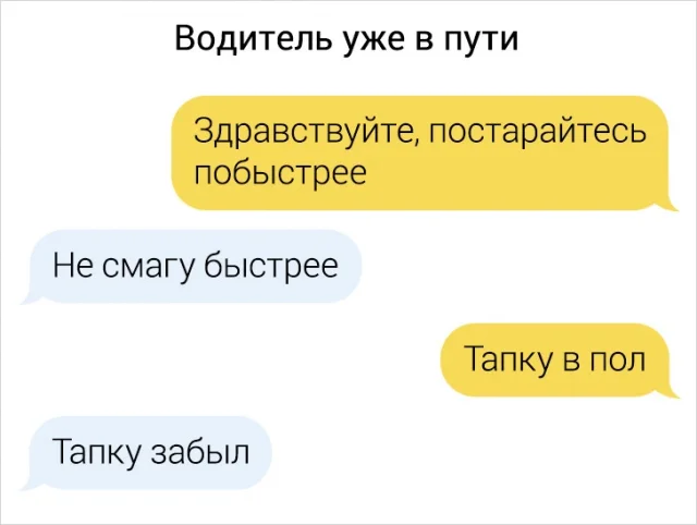 Сегодня уже мало кто заказывает такси по телефону. Нынче намного удобнее пользоваться приложением в смартфоне. Там можно видеть "онлайн", где находится водитель и также есть чат, где можно написать таксисту. И эти переписки уже стали давно самостоятельным поджанром юмора в Сети. Давайте поднимем себе настроение и поглядим подборку забавных переписок с таксистами.