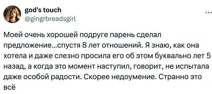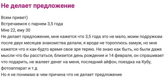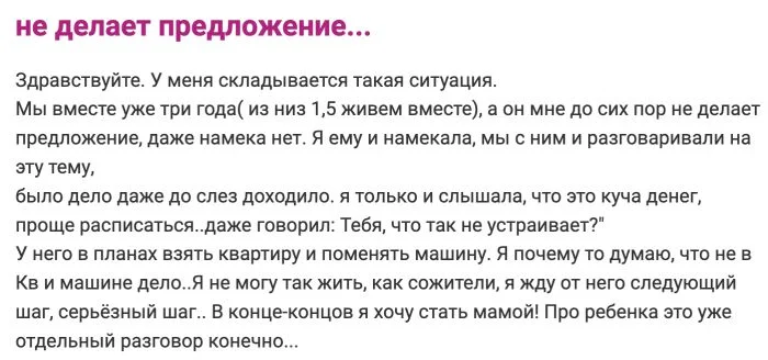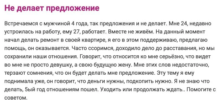 В отношениях девушки часто ждут, когда парни решатся сделать предложение. Иногда это ожидание затягивается. Психологи считают, что если в первый год мужчина не решился связать свою жизнь с женщиной, то после, вероятно, это не произойдёт. Давайте узнаем разные истории от прекрасных дам.