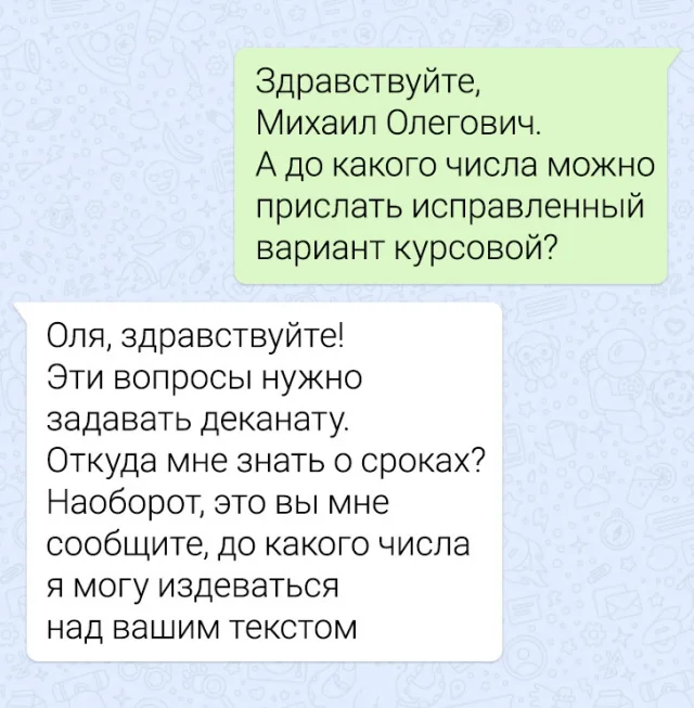 Большинство наших чатов в мессенджерах и соцсетях - это самое обычное общение. Но иногда диалоги так лихо закручиваются, что кажется, будто бы их писал сам Тарантино. Ну что ж, давайте поднимем себе настроение и поглядим новую подборку забавных переписок.