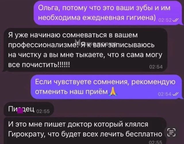 Девушка решила записаться к стоматологу на чистку зубов. Комплексная стоматологическая гигиена полости рта включает снятие мягких и твердых отложений, которые может убрать только специалист. Это навело барышню на мысль, мол, зачем тогда зубы чистить? Стоматолог же и так порядок наведет? Логично? Очень! Так между "логичной" девушкой и стоматологом завязался крайне странный диалог. Да... "клятву Гирократа" сейчас кто попало дает.