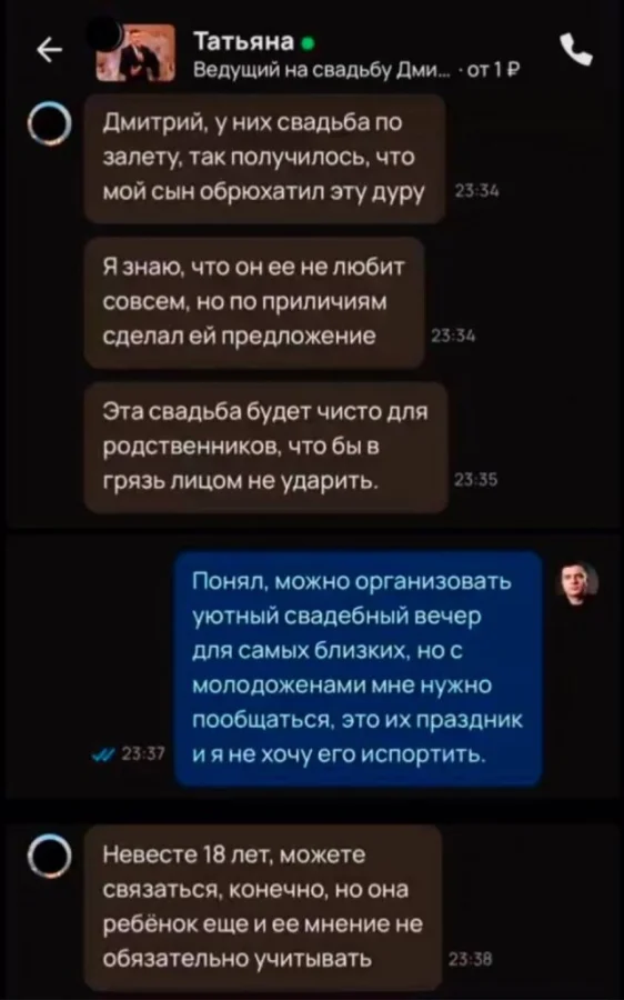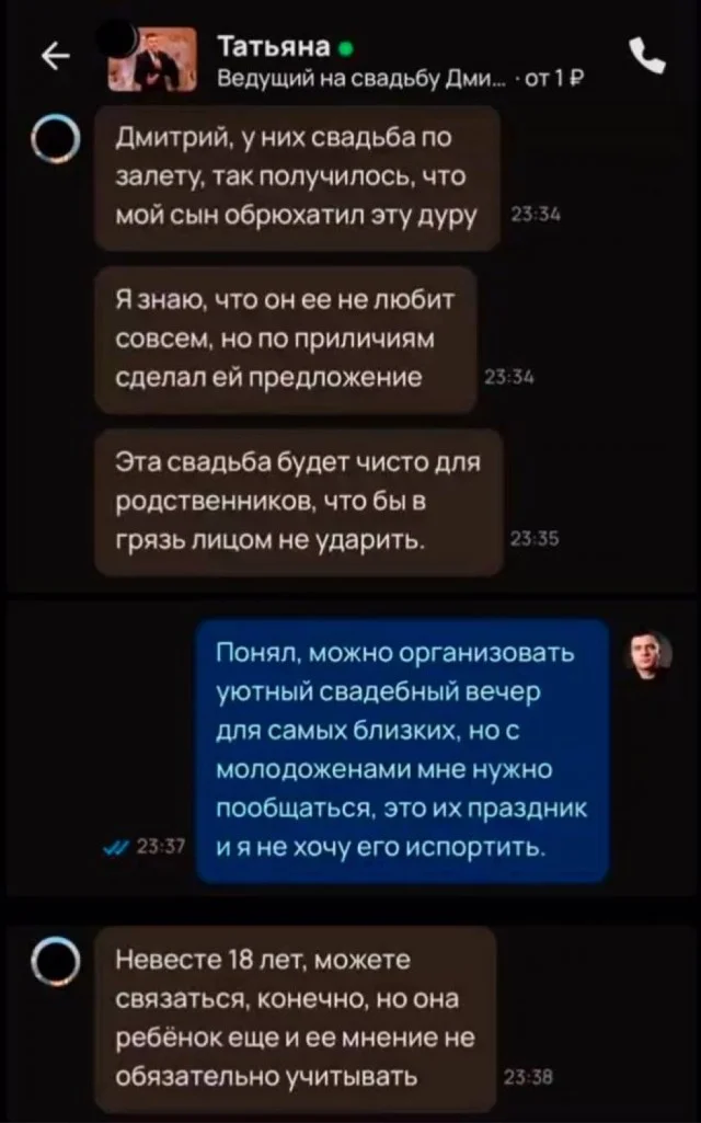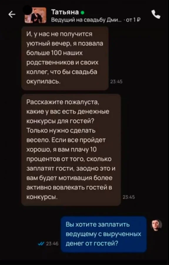 Тамада хотел увидеться с молодожёнами для организации свадьбы, но мать жениха предложила альтернативную форму оплаты — процент от подарков гостей.