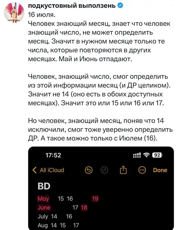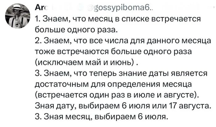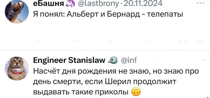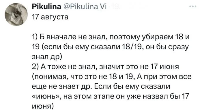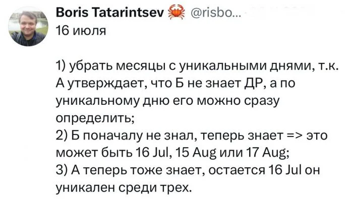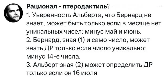Альберт: Я не знаю, когда у Шерил день рождения, но я знаю, что Бернард тоже не знает.